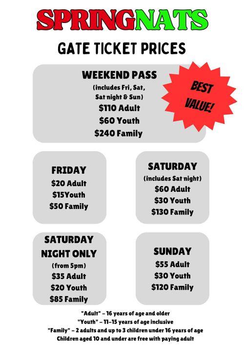 Tickets will be available to purchase at the gate for Autofest Springnats 2025. Please see the gate prices listed below.