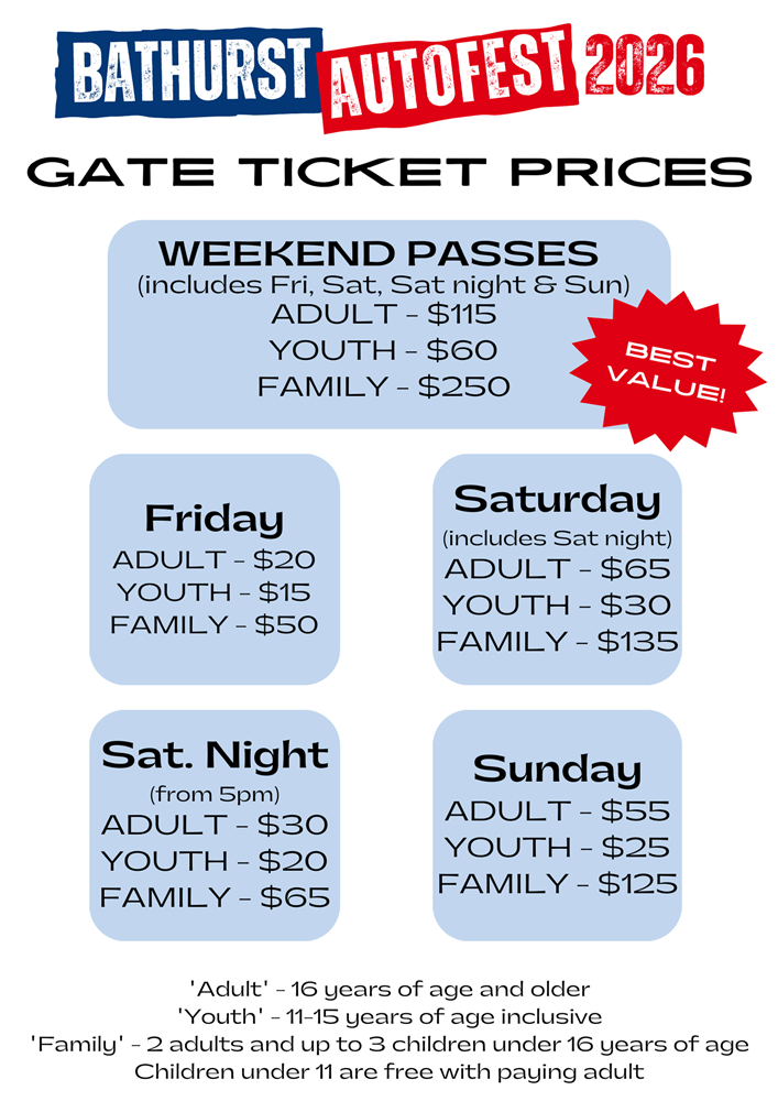 On your arrival at Mount Panorama, please enter the event via the Conrod Straight gate. If towing please head to the trailer area to unload your vehicle before making your way into the Autofest Office where you will be issued with your vehicles official entrant windscreen sticker, along with your official pass for the driver and any buddy passes or merchandise that you have pre-purchased.